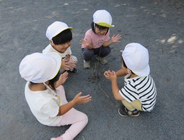 一緒にかばさん公園に遊びに来ていたひまわり組(2歳児)は、その日がお誕生日だったお友だちのためにお砂のケーキをプレゼント♪