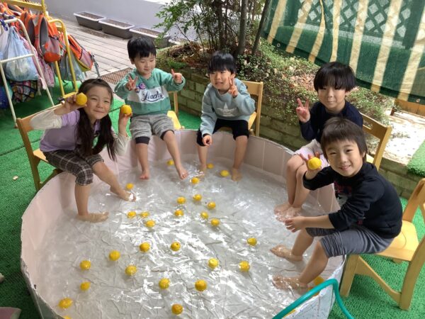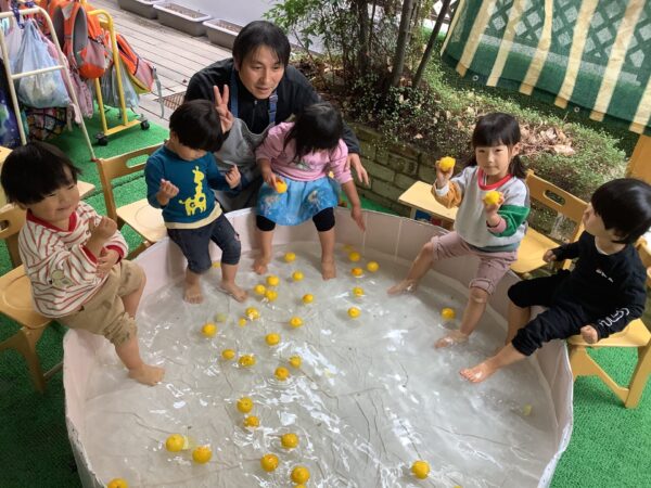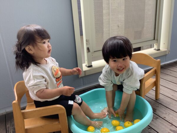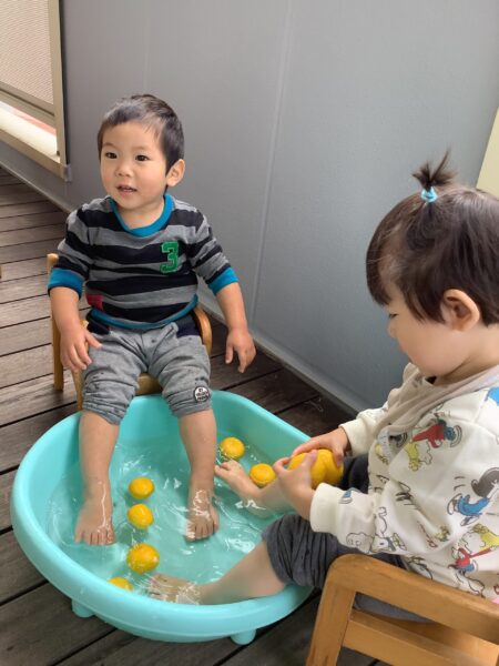 2.3.4.5歳児さんは、1階のウッドデッキに大きなビニールプールを出して足湯屋さん♨