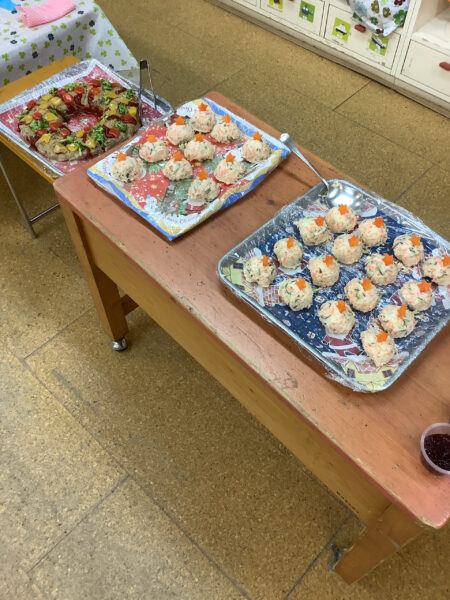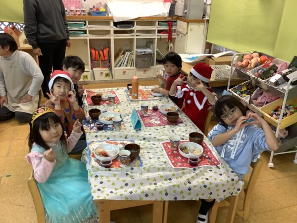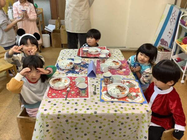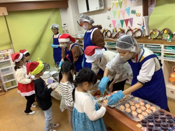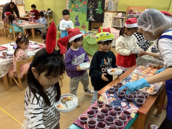 一人ずつお皿をもって並び、サンタやトナカイからごはんやおかずを取り分けてもらいます♪