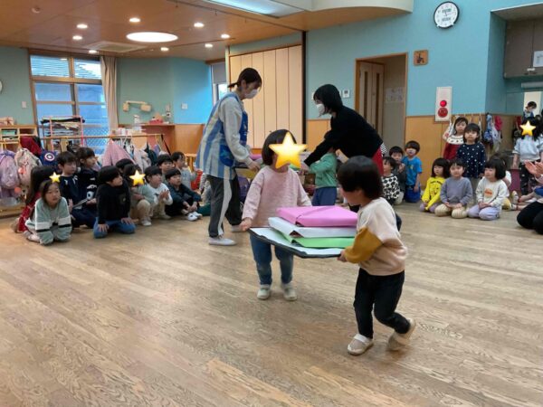 2~5歳児は2人1組でひしもち運びゲームをしました。